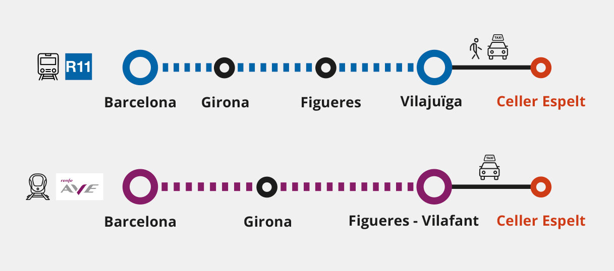 Taxi: Per arribar des de l’estació de Figueres-Vilafant necessitaràs un taxi. Nosaltres ho podem gestionar per tu: ens hauràs de comunicar la teva hora d’arribada i també la de tornada. Telèfon Taxi 610738488